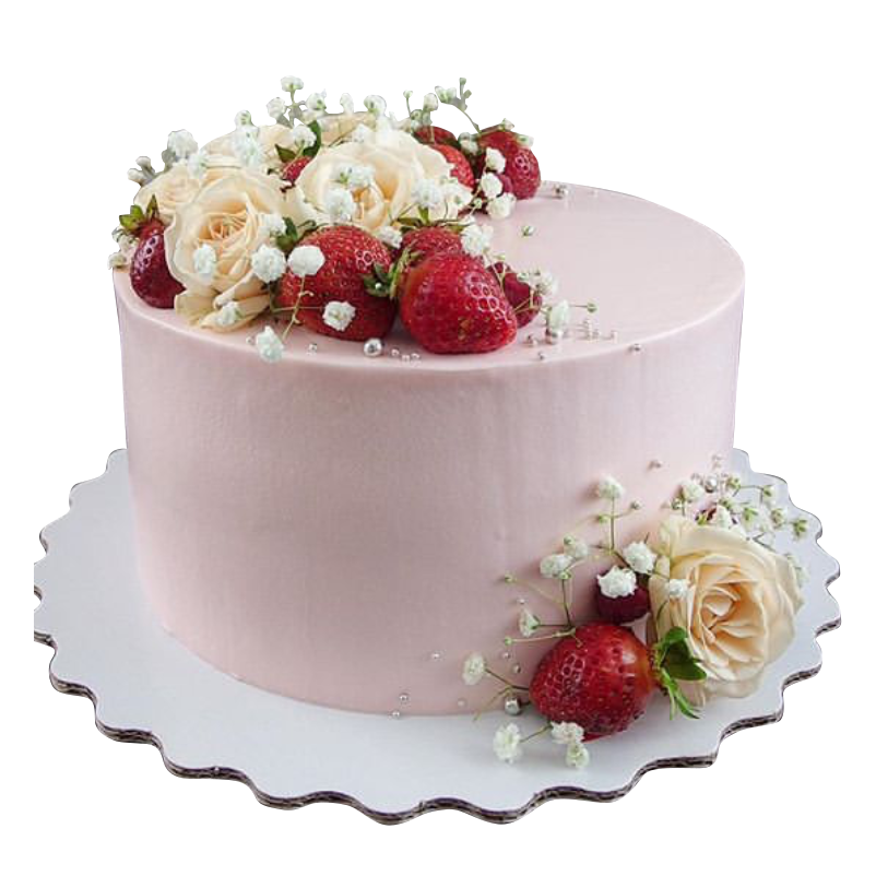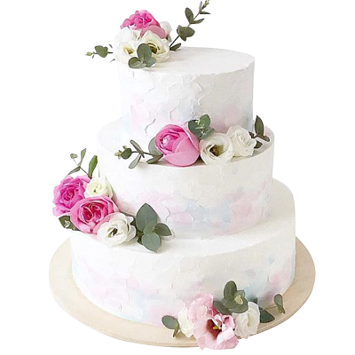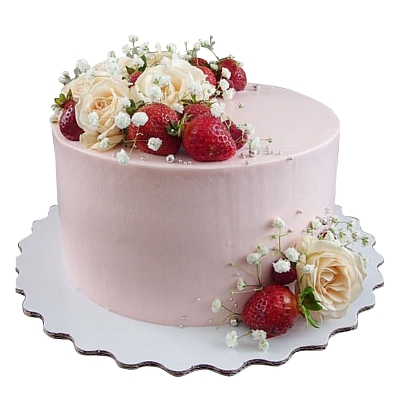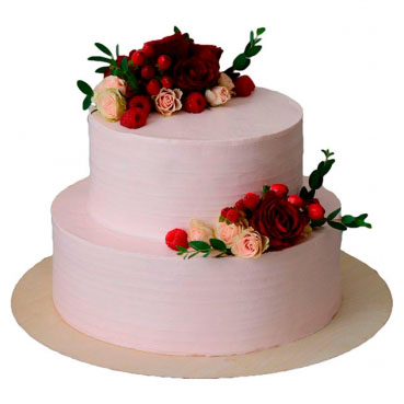 Нежнейший торт с ванильным бисквитом, украшен свежими цветами розы и пиона.